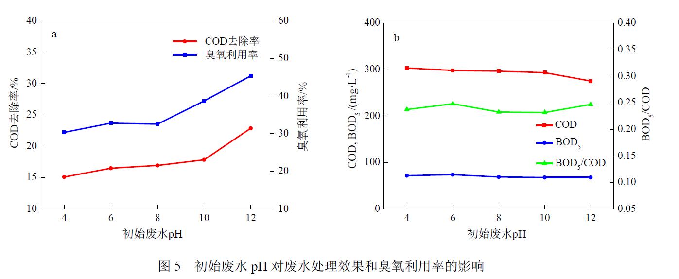 由图5b 可见,随着初始废水pH 的升高,COD 不断降低,BOD5 也略有降低,水体的BOD5/COD 变化不大,整体保持在较高水平。原因可能是,随着初始废水pH 的升高,促进了·OH 的产生,在·OH 的作用下,部分容易降解的物质直接被氧化成CO2 和H2O,导致BOD5 出现小幅下降。现场原水pH 在7~8 间波动,考虑到实际生产需求,初始废水pH 保持原水pH 进行实验,不加处理。