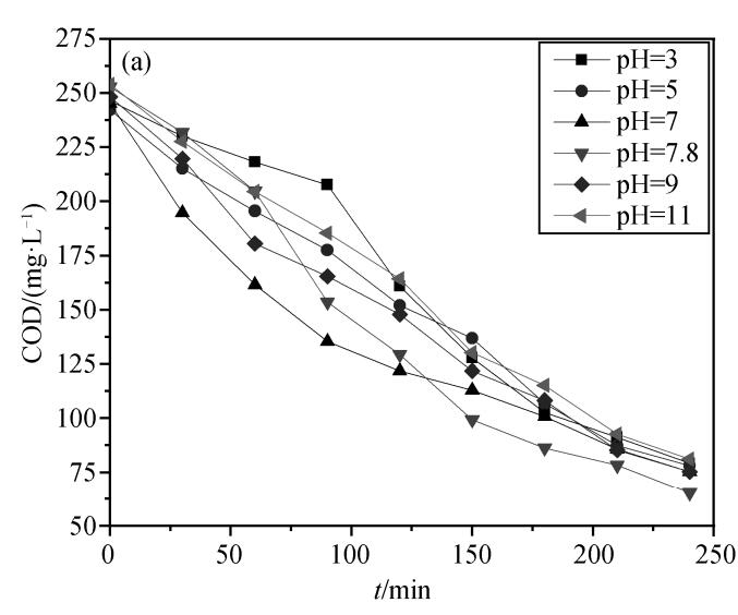 在催化剂投加量为 30%, 快猫社区APP成人官网流量为 3 L/min的条件下, 设置废水初始 pH 分别为 3, 5, 7, 7.8 (不调 pH), 9 和 11, 探讨废水初始 pH 对催化快猫社区APP成人官网化降解效果的影响, 结果如图所示。